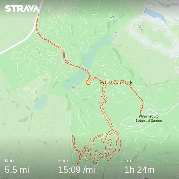This race is at Freedom Park in Williamsburg, VA and starts at 6pm. The Start/Finish will be in the meadow parallel to the Botanical Garden area. The challenging course includes single track, fire road and paved trails all within the park. Rolling hills throughout. Keep in mind some of the trails are technical and have roots, twists and turns! Practice on mountain bike type singe track trails if available! Race will happen rain or shine with a possibility of a 30 min delay if needed for storms.